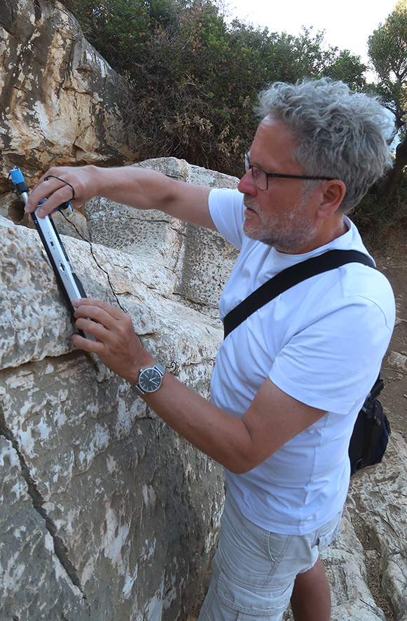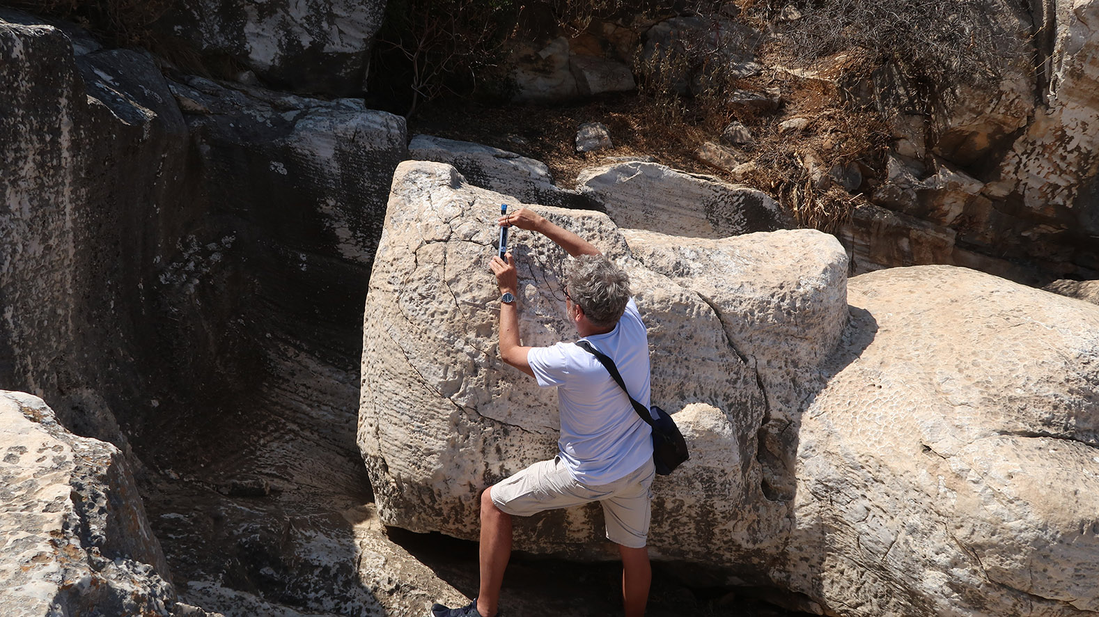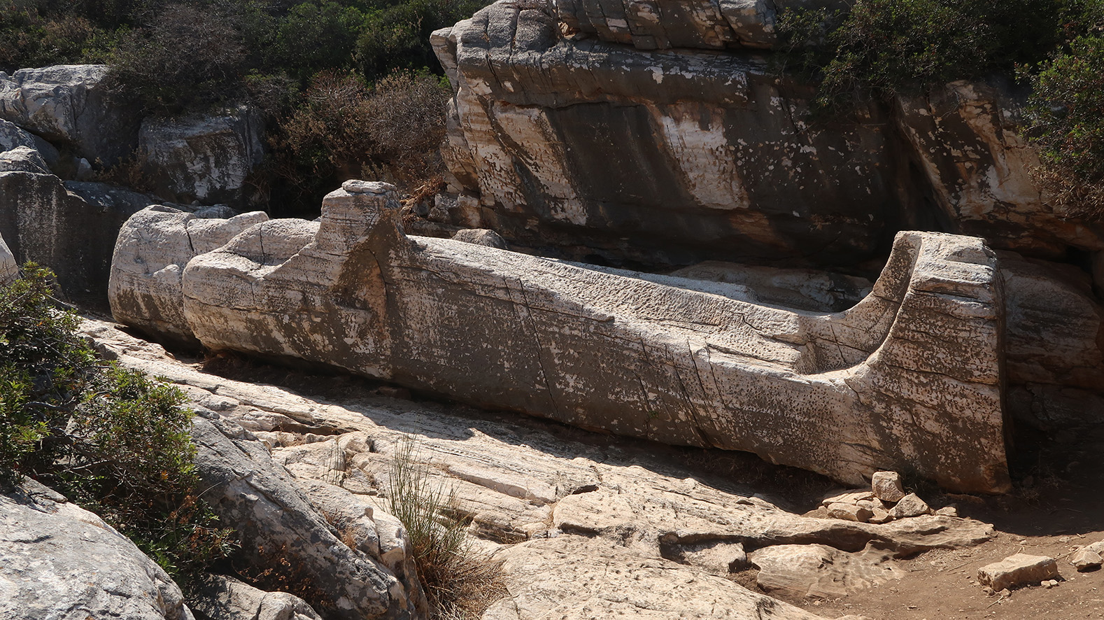 The unfinished Kouros of Naxos, a huge marble sculpture measuring around eleven metres, was simply left behind in the countryside and abandoned around 500 BC after being cut out of the marble rock and undergoing initial preparatory work. Why this happened remains a matter of debate to this day. There is much to suggest that the huge sculpture was damaged during the work and would therefore not have survived subsequent transport. A mighty undertaking – perhaps to create the largest sculpture of its time – failed. A strange feeling of sadness and despair is still palpable today. After such hard and intensive work on the stone, how must the workers have felt at the time? What interests me about this sculpture, which never reached its destination and was never later presented in a museum, is precisely this aspect of failure, of incompleteness. Instead of admiring only the perfect forms of the finished Kuroi in museums, I sought out this imperfect, failed sculpture in Apollonas, one of the most important marble quarries of antiquity.